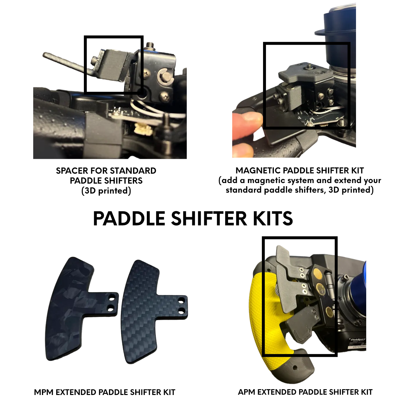 Extended Paddle Shifter Kit: 3D printed Standard Spacer Kit, or 3D printed Magnetic Shifter kit or MPM extended paddles kit made in Twill, Forged or Green Speck Carbon or APM extended paddles kit made in Twill, Forged or Green Speck Carbon.
