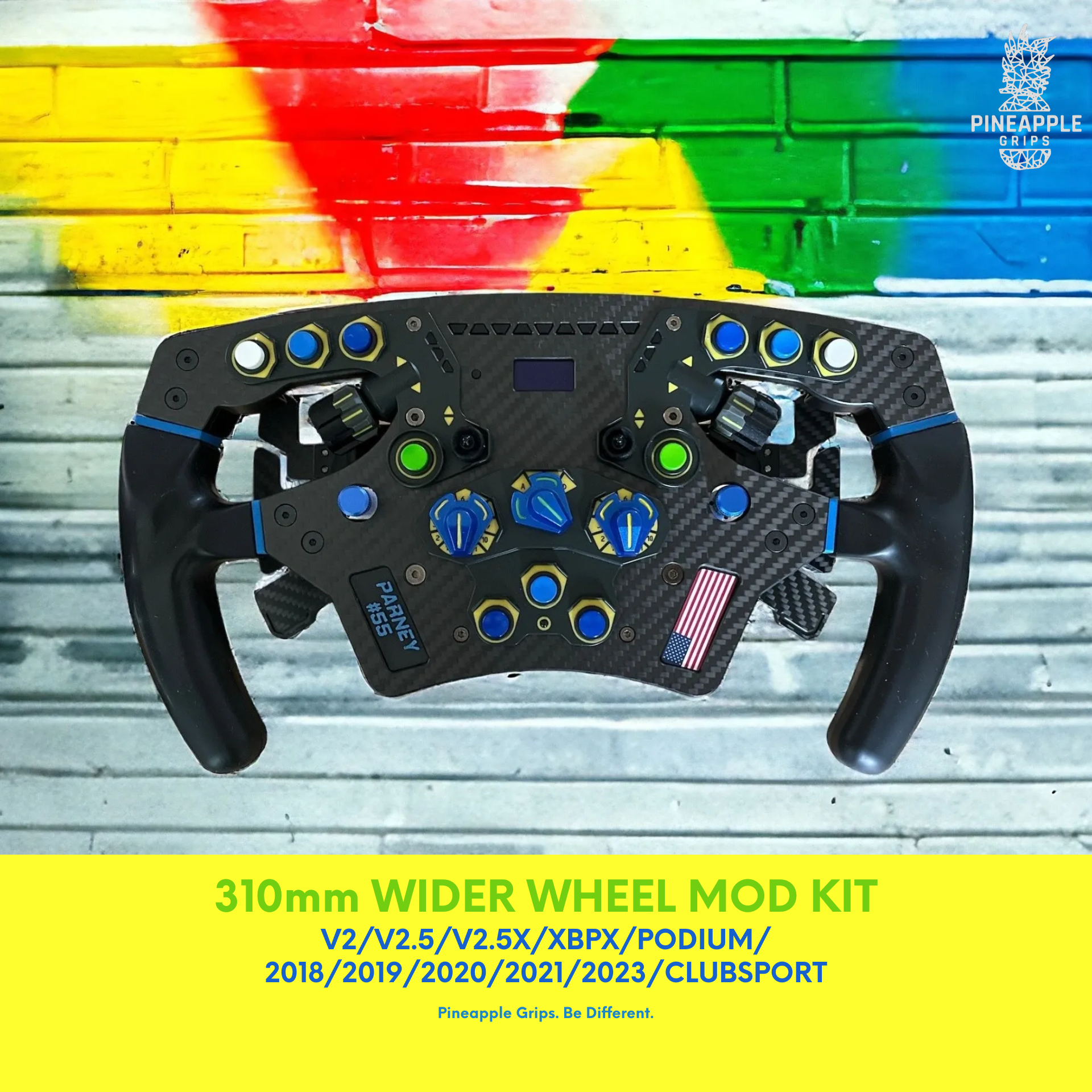 Open Bottom wheel plate design only. If you are looking to turn your Fanatec wheel into an LMP/GT style wheel then 310mm is a great diameter to convert it to. Increase your Wheel to 310mm wide with our Wider Wheel Mod Kit. Compatible with Fanatec Formula V2, V2.5, V2.5X, Xbox, Podium, 2018, 2019, 2020, 2021, 2023 and ClubSport wheel versions.