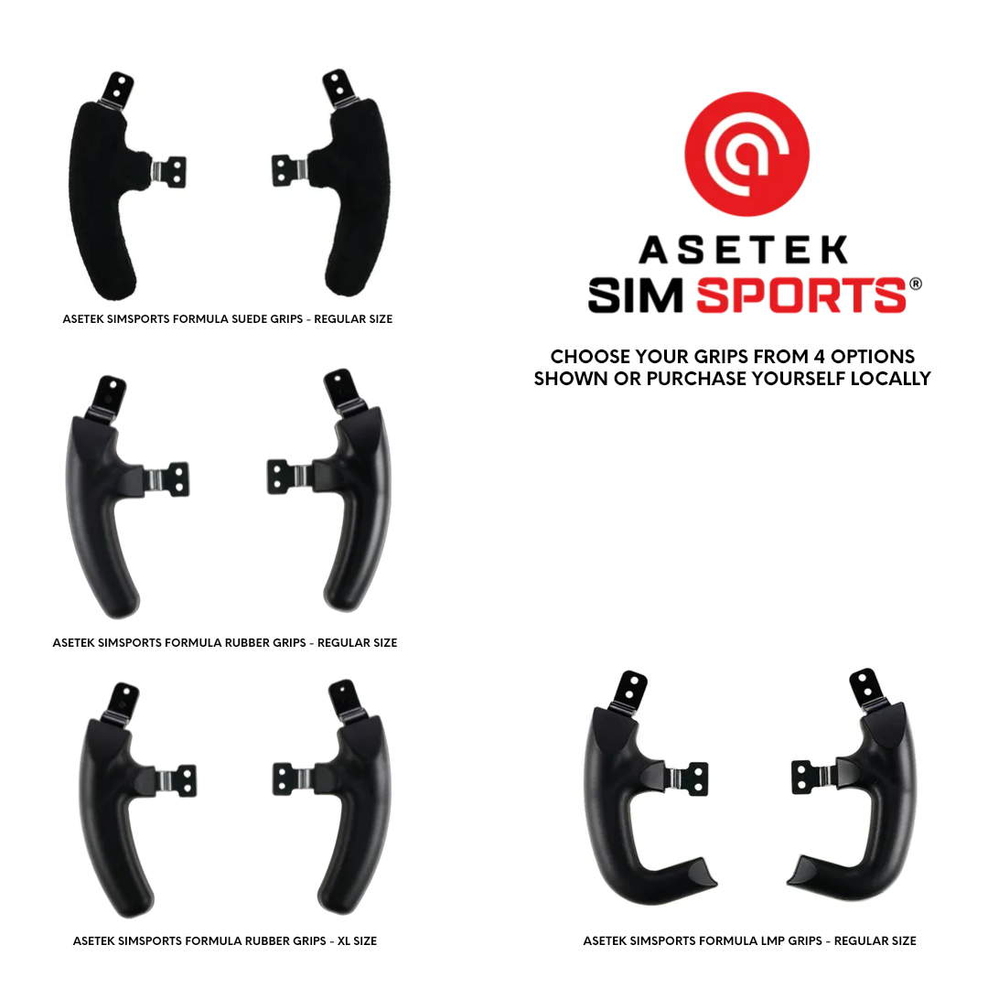 If you want to source the grips locally you now have that option, or we can continue to supply them with the kit. You have 5 grip options to choose from (4 Asetek SimSports grip offerings (or a fifth Pineapple Grip option in napa leather/any of our other material coverings, just contact us for more details):