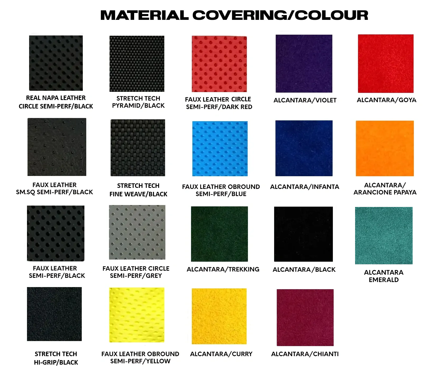 Unsure about which material you like? Get to see the real colour, feel the grip finish and hold them up against your existing grips and wheel colour scheme to help you decide. All 19 currently available grip materials supplied in a compact 30mm square samples: 9 genuine Alcantara colours, 9 faux leather and 1 Real Leather sample