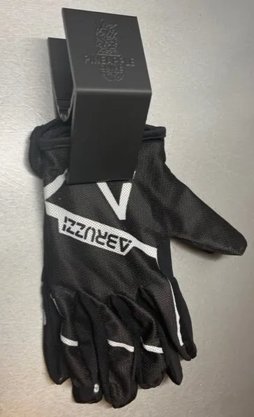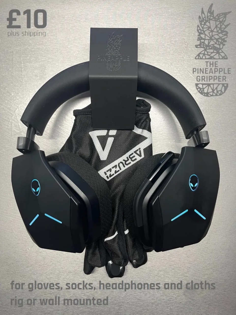 Pineapple Gripper! Conceived for gripping and storing your sim racing GLOVES but it soon became obvious it can be used to simultaneously store various combinations of your GLOVES, sim SOCKS, HEADPHONES and CLOTHS. Can be RIG MOUNTED (fixings supplied) horizontally or vertically in the extrusion or WALL MOUNTED (note: customer is responsible for fixing to a wall using their own method)